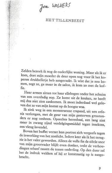 ‘Boven het buffet verzet hun portret zich vergeefs tegen de inwerking van het zonlicht. Iedere keer als ik het terugzie is het valer geworden. Alleen de volle fin de sciècle snor van mijn grootvader blijft even donker, trekt de verhouding scheef tussen de tonen onderling.’