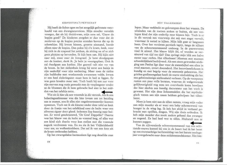 Het tillenbeest! Mannen met mannen schandelijkheid bedrijvend. Als een steen geworden uitdaging aan Paulus ligt daar voor de statenbijbel een sfinx in rood marmer, zwart dooraderd. Het leeuwinnelichaam is kundig en met begrip voor anatomie gehouwen. Het griekse godinnegelaat heeft de starre uitdrukking die het een geheimzinnige zielloosheid verleent. Op de voorpoten rusten een paar volle borsten…