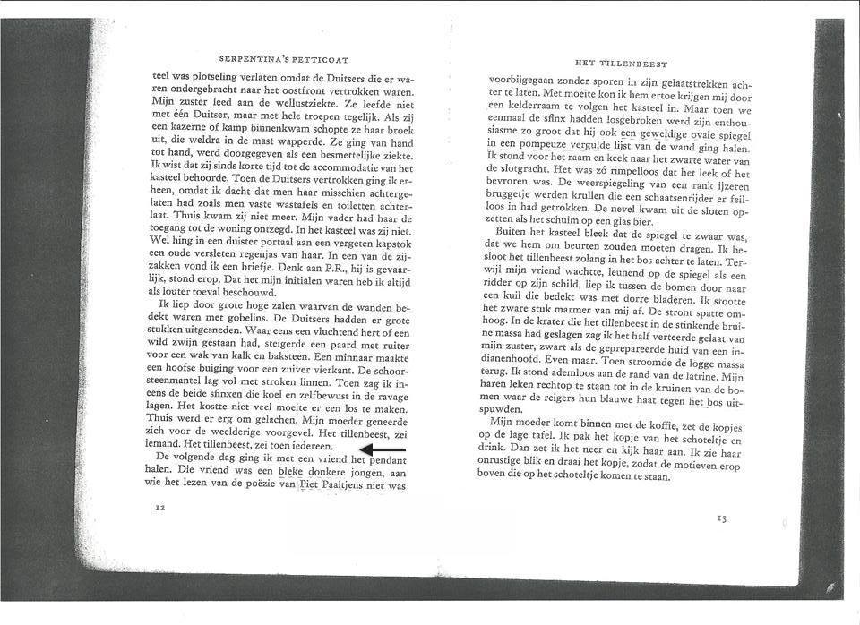 Mijn zuster leed aan de wellustziekte. Ze leefde niet met één Duitser, maar met hele troepen tegelijk. Als zij een kazerne of kamp binnenkwam schopte ze haar broek uit, die weldra in de mast wapperde. Ze ging van hand tot hand, werd doorgegeven als een besmettelijke ziekte. Ik wist dat zij sinds korte tijd tot de accommodatie van het kasteel behoorde. Toen de Duitsers vertrokken ging ik erheen, omdat ik dacht dat men haar misschien achtergelaten had zoals men vaste wastafels en toiletten achterlaat. Thuis kwam zij niet meer. Mijn vader had haar de toegang tot de woning ontzegd.