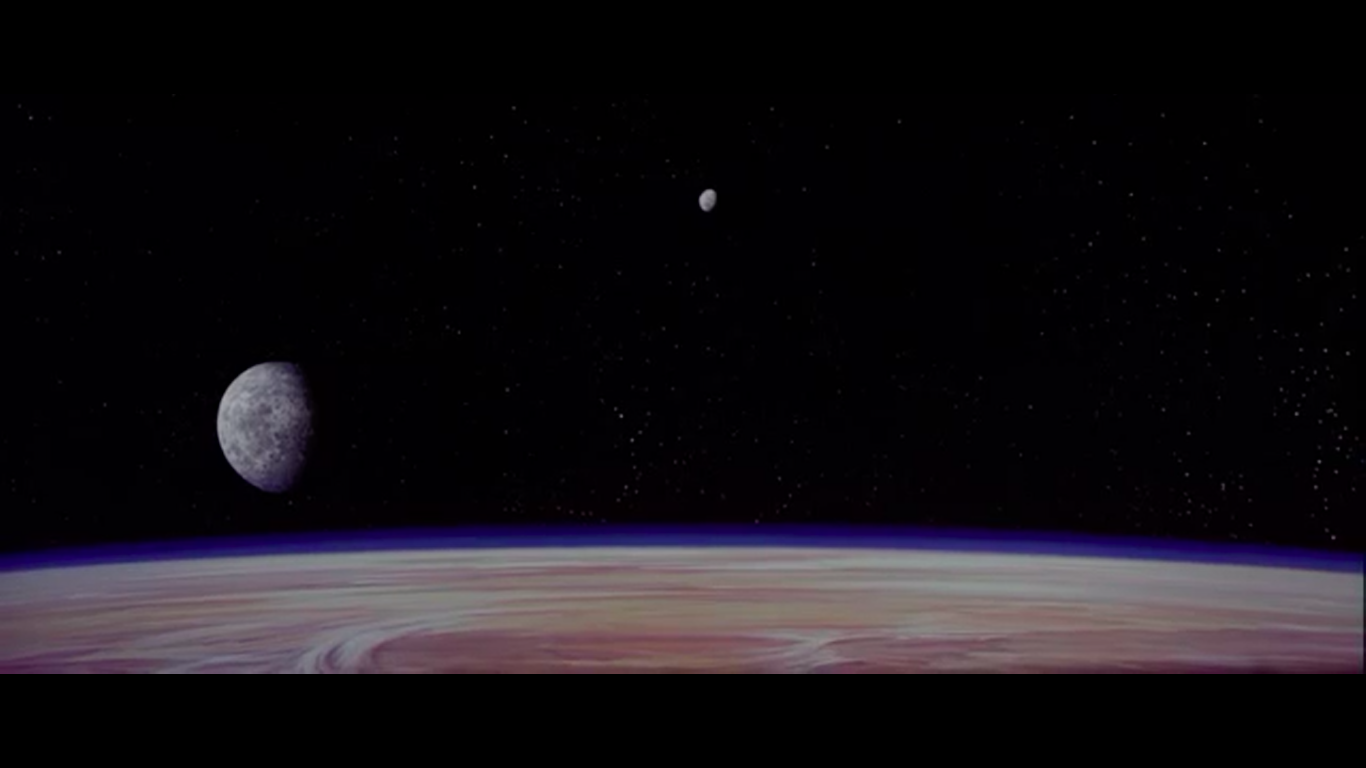 A) Panoramashot (establishing shot): openingsshot, geeft de ruimte (letterlijk) in zijn totaliteit weer. De planeten en ruimteschepen zijn minuscuul/nog niet zichtbaar.