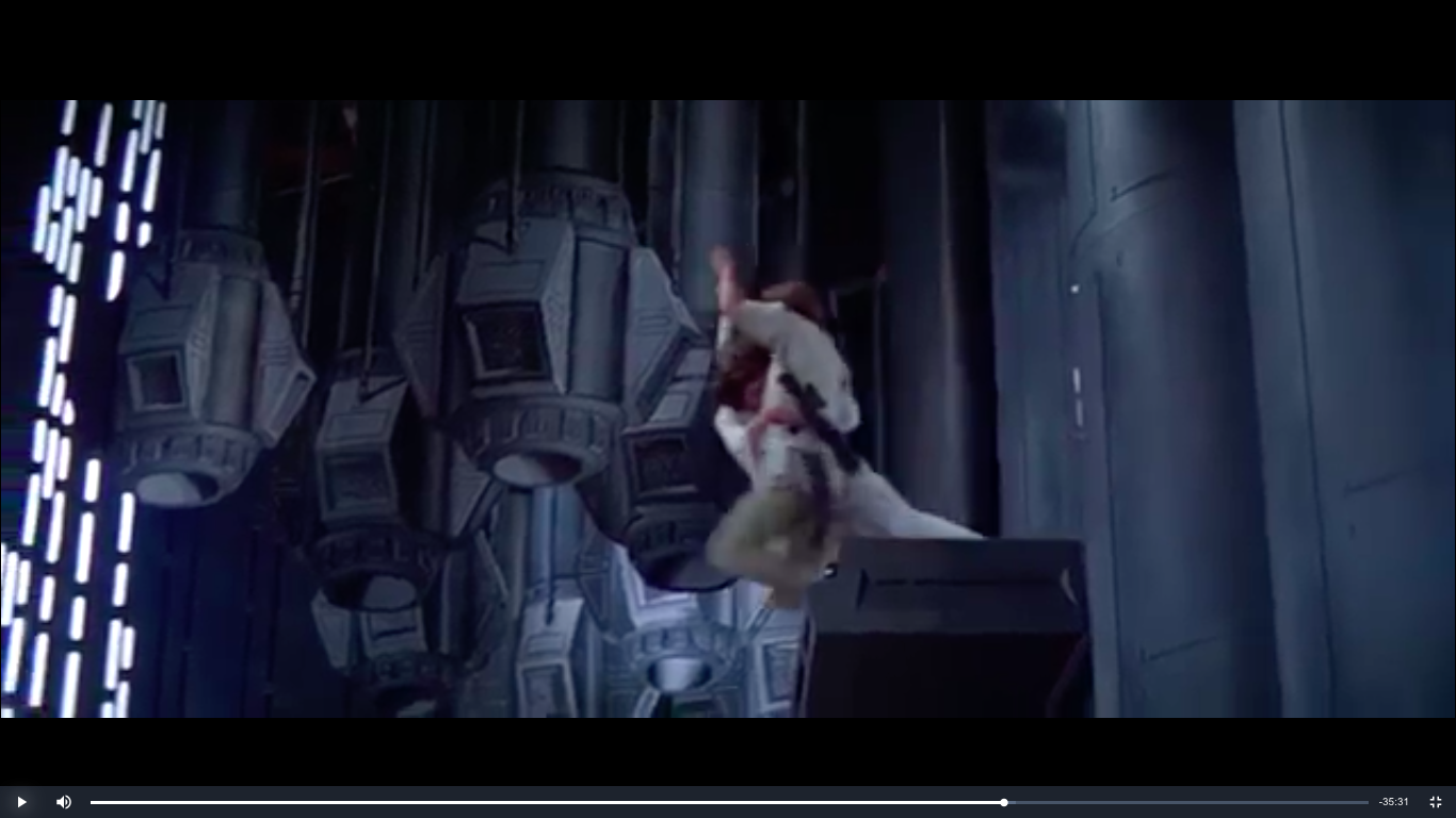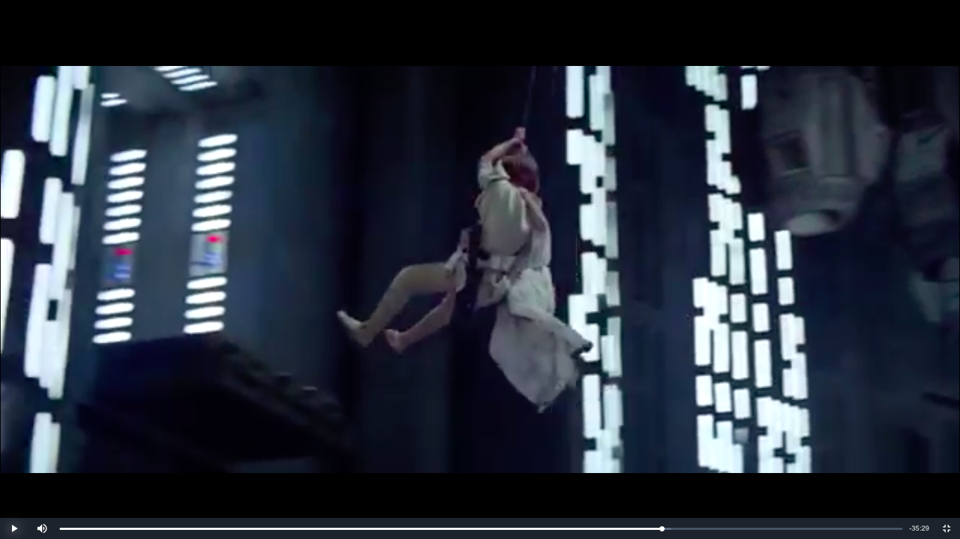 C) Lift/tracking shot: Luke en Leah zijn ingesloten. Terwijl Leah schiet, haalt Luke een touw tevoorschijn. De kijker krijgt al een vermoeden over wat er te gebeuren staat. Dan maakt Luke het touw vast en springen hij en Leah samen naar de overkant.