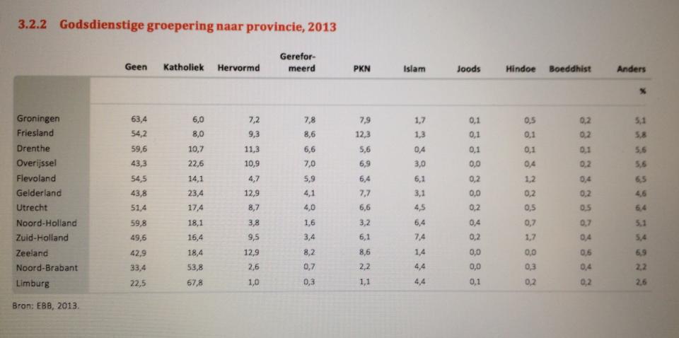 In de meeste provincies zijn de inwoners atheïstisch. Daarnaast kunnen we ook nog een klein deel van de bevolking bij de Rooms-katholieke kerk en het protestantisme onderbrengen. De ledenaantallen van de andere godsdiensten liggen zeer laag. Noord-Brabant en Limburg zijn de enige provincies waarbij de meerderheid van de bevolking katholiek is. We zien dat hier amper aanhangers van het protestantisme leven. Een vijfde van de bevolking blijft atheïstisch. Wat toch veel is, voor een minimum te zijn in Nederland.